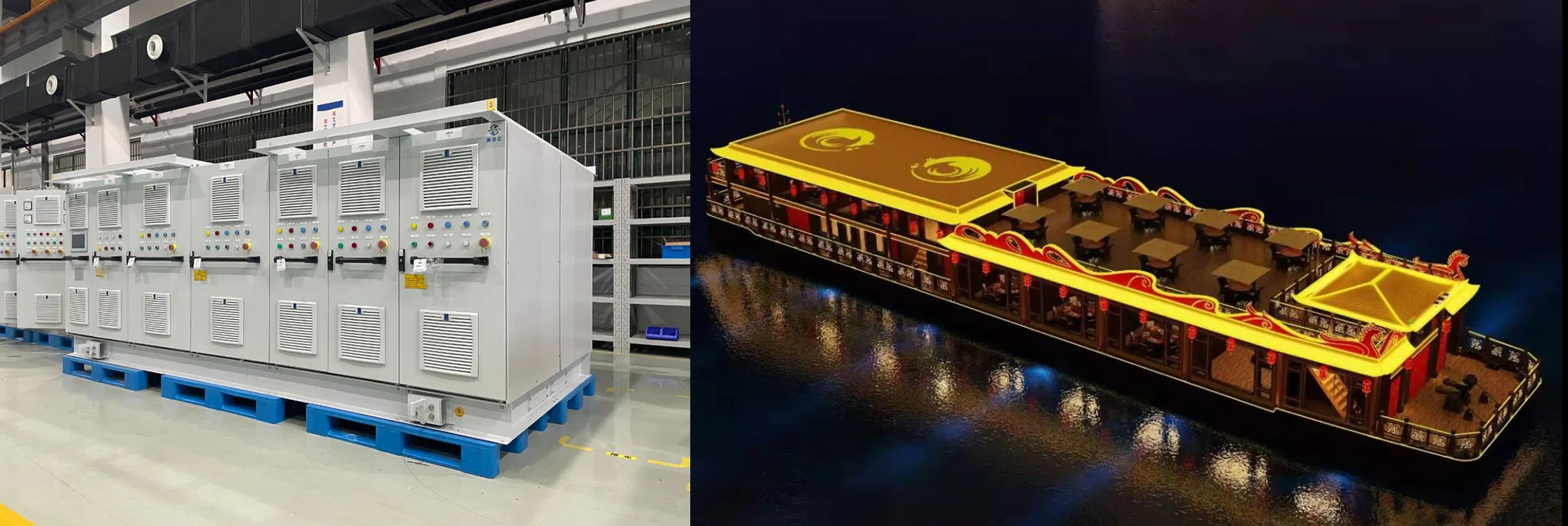 “大唐1號”游船由廣元市武則天文化旅游產(chǎn)業(yè)發(fā)展有限公司打造,由中國船舶集團有限公司第七一九研究所總體設(shè)計并集成供貨,賽思億國產(chǎn)變頻電控設(shè)備成為其關(guān)鍵設(shè)備供應(yīng)商,為該系統(tǒng)提供共直流母線裝置。該船總長50.8m,型寬10.8m,型深2.8m,載客300人,整船鋰電池容量共計1397.76kWh,是目前西南地區(qū)電池容量最大、船舶尺度最大的純電動客船。該船動力系統(tǒng)經(jīng)過賽思億自主知識產(chǎn)權(quán)的直流母線變頻電控設(shè)備在直流母線進(jìn)行并網(wǎng),驅(qū)動2臺225kW的全回轉(zhuǎn)舵槳,同時可為船舶日用負(fù)載提供高品質(zhì)的日用交流電源。