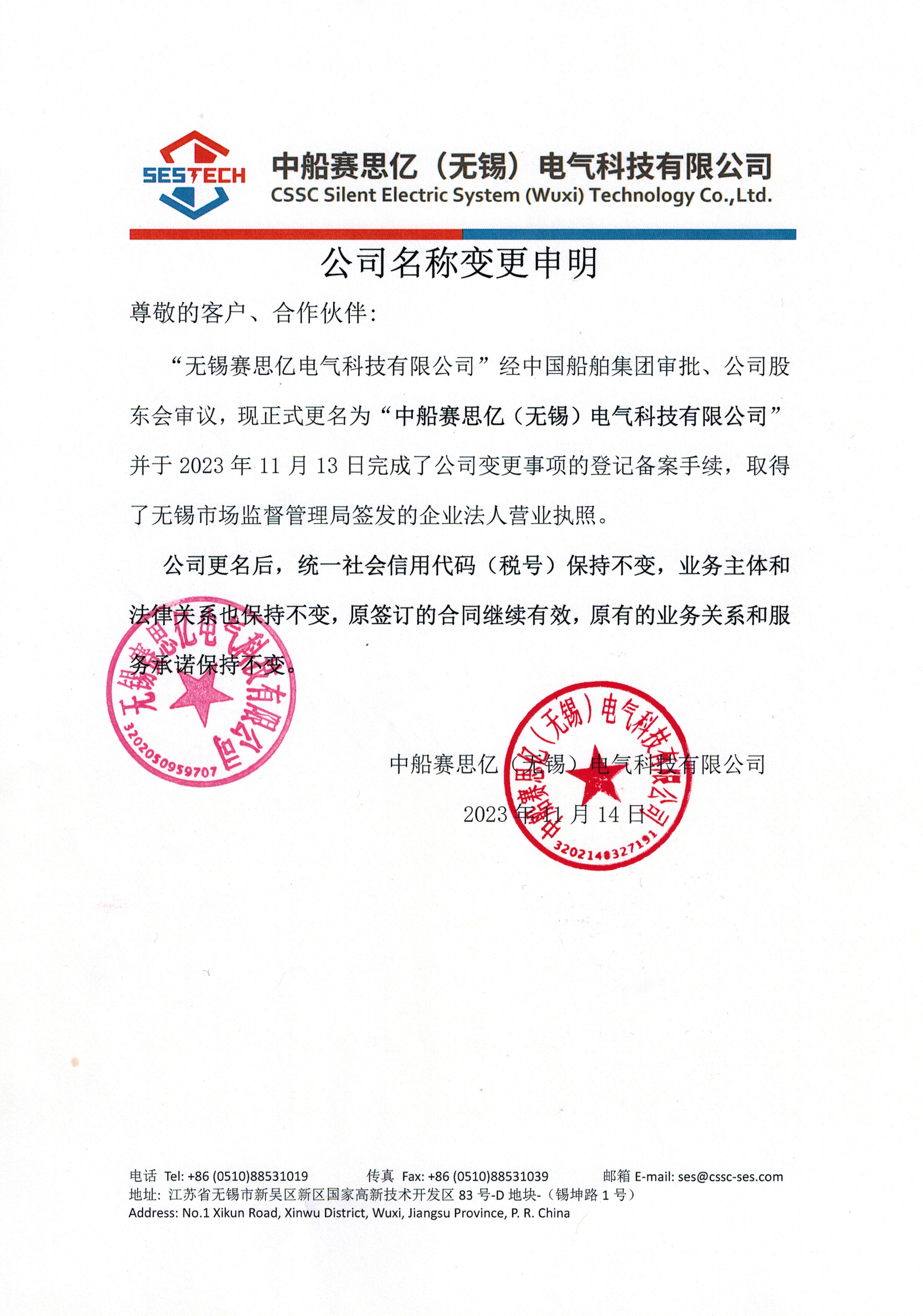 經(jīng)中國船舶集團(tuán)審批、公司股東會(huì)審議,2023年11月13日,無錫賽思億電氣科技有限公司正式取得無錫市場(chǎng)監(jiān)督管理局簽發(fā)的企業(yè)法人營業(yè)執(zhí)照,更名為“中船賽思億(無錫)電氣科技有限公司”,簡(jiǎn)稱“中船賽思億”。