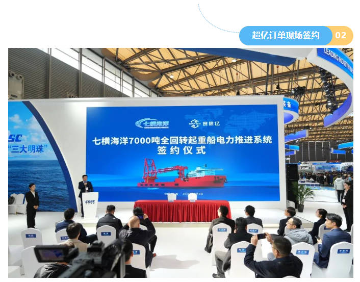 12月6日,七橫海洋7000噸全回轉(zhuǎn)起重船電力推進系統(tǒng)簽約儀式在W5館中國船舶集團發(fā)布區(qū)正式舉辦。簽約儀式由中船賽思億營銷總監(jiān)郭偉主持,上海七橫海洋工程有限公司董事長潘喜、中船賽思億總經(jīng)理烏云翔發(fā)表致辭。在七橫海洋董事長潘喜、總經(jīng)理姜鵬、中船賽思億總經(jīng)理烏云翔、副總經(jīng)理邵詩逸、江蘇海藝船舶科技有限公司總經(jīng)理陶開友、江蘇創(chuàng)譽船舶與海洋工程有限公司總經(jīng)理祁長青等見證人的見證下,七橫海洋商務(wù)總監(jiān)史泰龍、中船賽思億副總經(jīng)理桑成棟順利完成簽約。