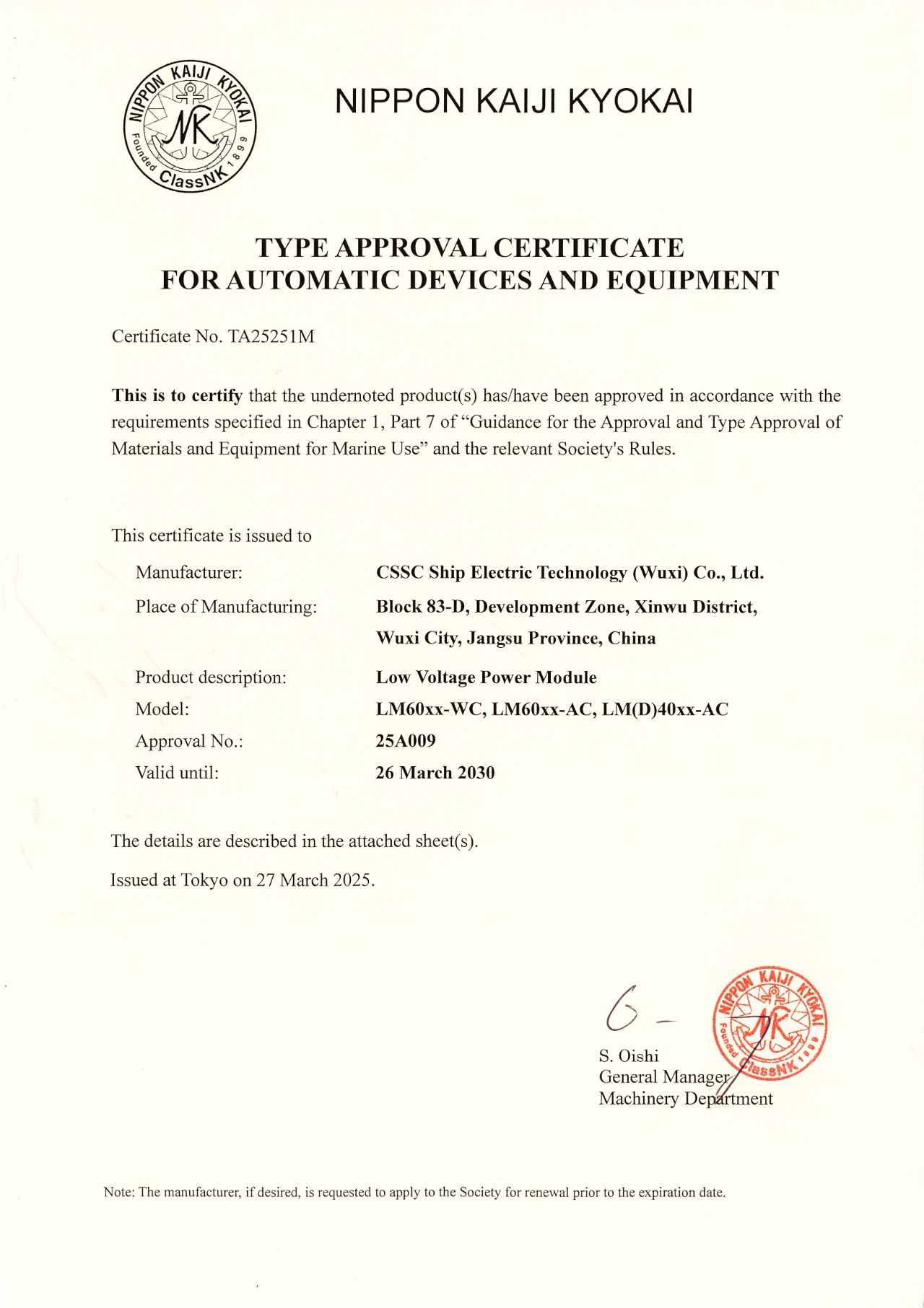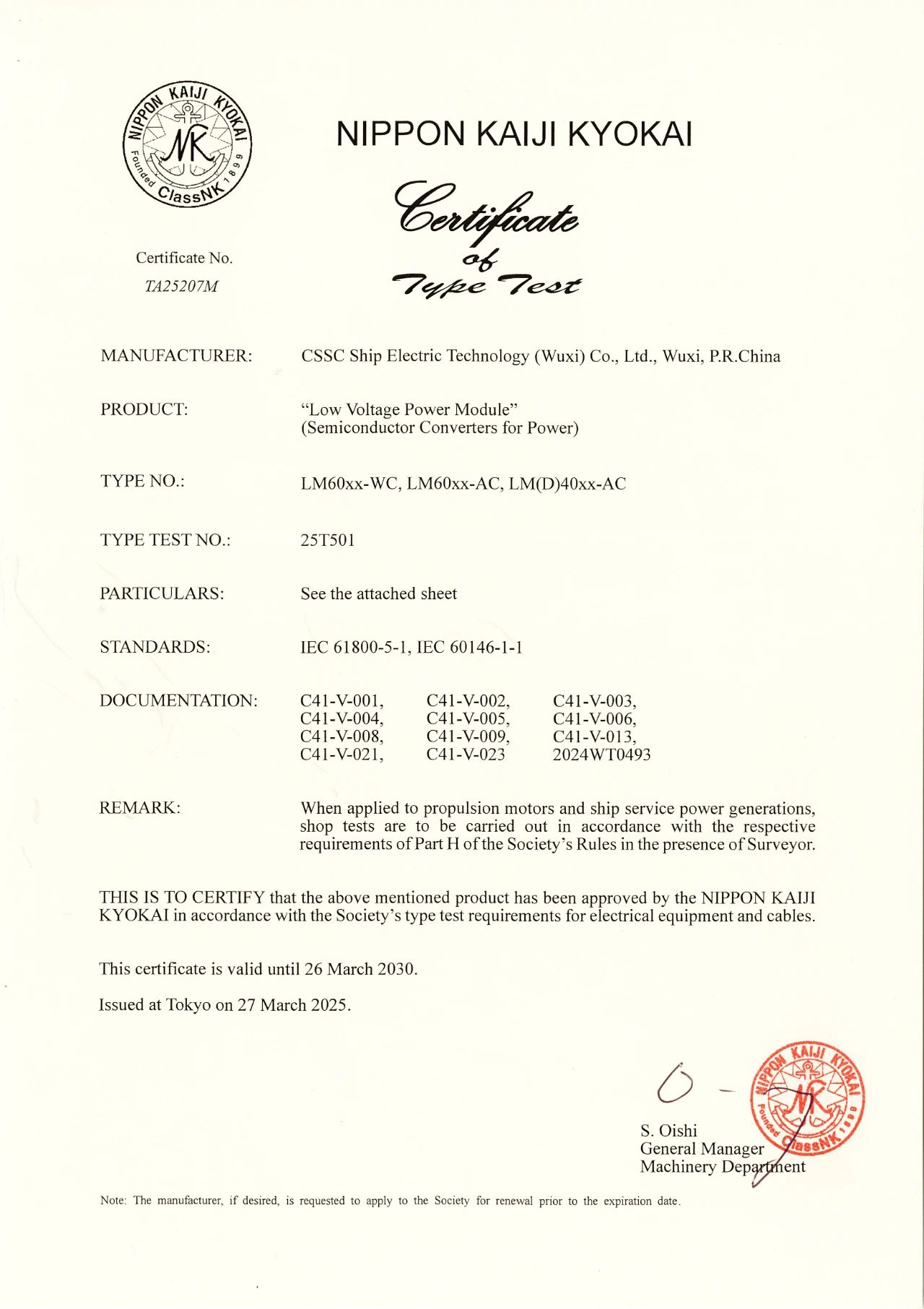 2025年3月27日,中船賽思億(無錫)電氣科技有限公司(CSSC Ship Electric Technology ( Wuxi) Co.,Ltd.)核心變頻電控設備順利取得日本船級社(NK)型式認可證書,成為國內(nèi)為數(shù)不多的取得日本船級社(NK)型式認可證書的船舶電力推進企業(yè)。目前中船賽思億已取得CCS、BV、RINA、DNV、LR、ABS、NK等七大國際主流船級社型式認可證書,是目前國內(nèi)唯一一家擁有七大船級社型式認可證書的國產(chǎn)船舶電力推進企業(yè),對中船賽思億的海內(nèi)外市場開拓和國際化發(fā)展進程,具有重要意義。