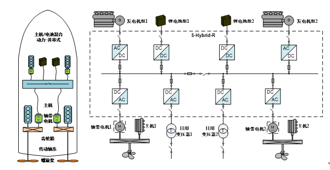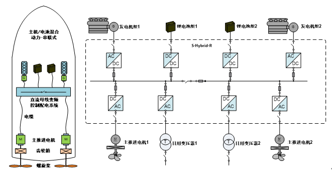 系統(tǒng)配置發(fā)電機(jī)組和超級(jí)電容作為游船動(dòng)力,采用S-Hybrid-R串聯(lián)式解決方案,系統(tǒng)集成度高、接口簡(jiǎn)便,明顯改善機(jī)艙設(shè)備占地空間及重量。