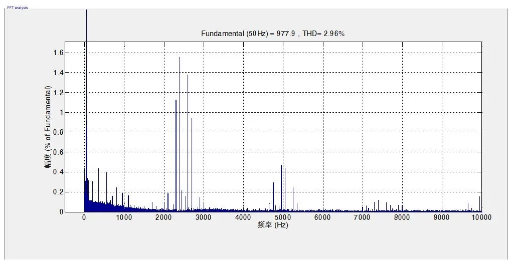 從圖表2可以看到,采用賽思億的變頻器,最大諧波源在于開(kāi)關(guān)頻率(2.5kHz)附近以及開(kāi)關(guān)頻率的2倍(5kHz)附近。