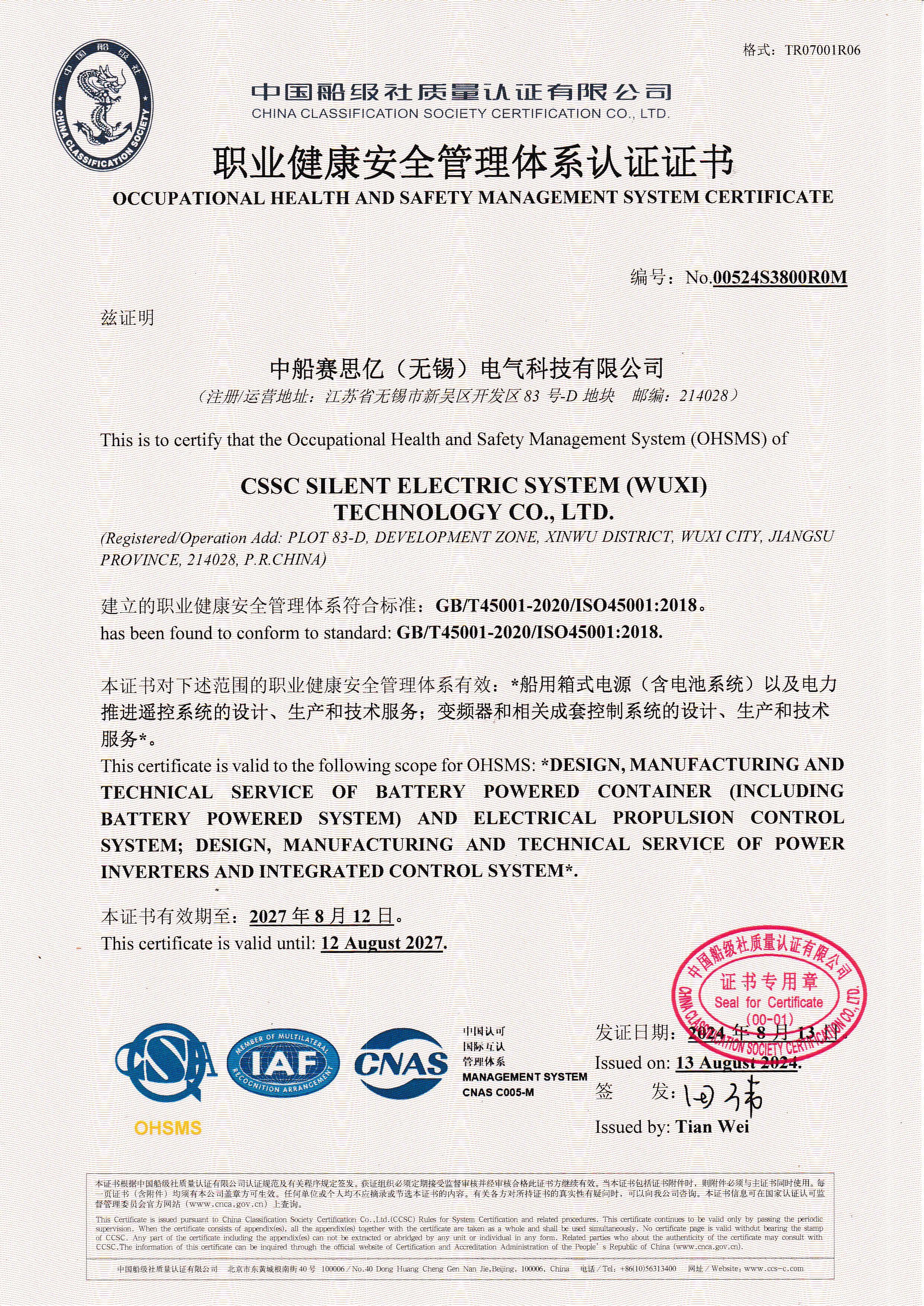 職業(yè)健康安全管理體系認(rèn)證證書(shū)