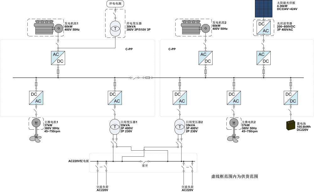批量四海風(fēng)行豪華游艇,整個動力系統(tǒng)配置2臺60kW的柴油機組、一套4.6kW的太陽能光伏板、一組105.6kWh的蓄電池組和2臺37kW的主推進電機。在觀光工況下,發(fā)電機組停止工作,使用蓄電池和太陽能為全船供電,可使用蓄電池組連續(xù)推進5小時左右,零排放、振動噪音小并且船員舒適性較好。