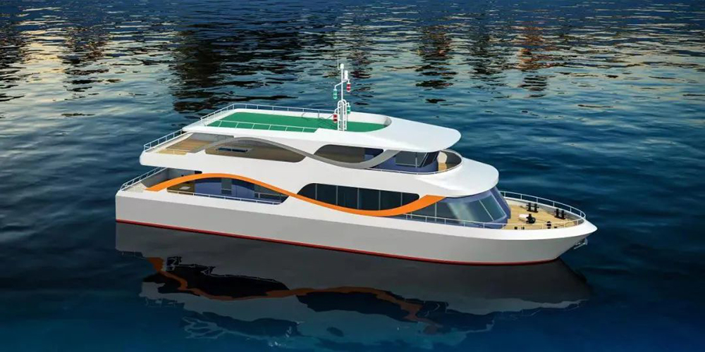 該電動客船,總長26.8米,型寬5.9米,型深2米,設計吃水1.0米,載客50人,入CCS船級,授予綠色船舶附加標志。整個系統(tǒng)配置共接入2組301kWh鋰電池組,經(jīng)過賽思億集中式的直流配電柜在直流母線進行并網(wǎng),驅(qū)動2臺60kW主推電機。其中直流變頻電控系統(tǒng)核心設備采用賽思億自主知識產(chǎn)權產(chǎn)品。