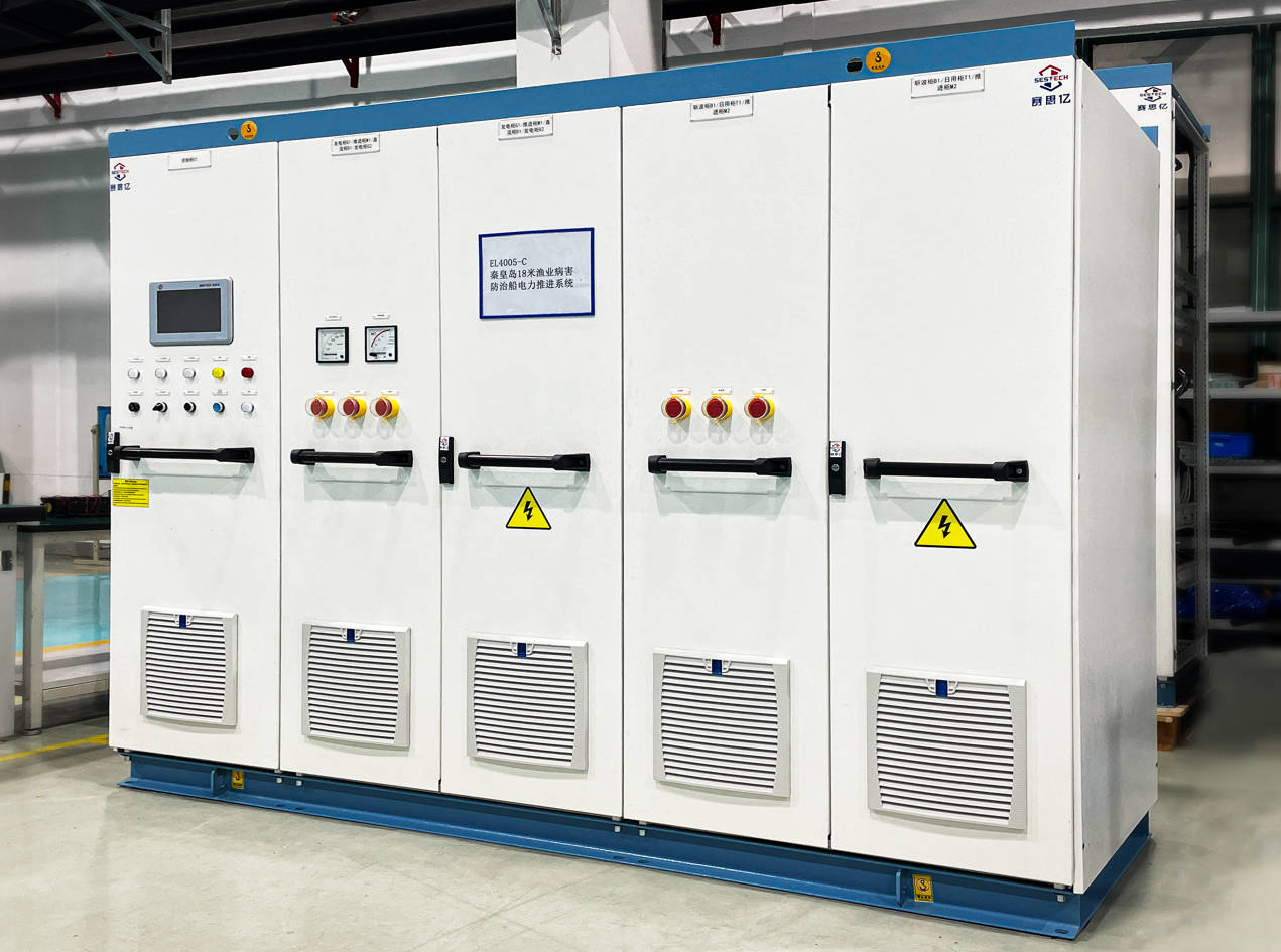 該6艘系列船舶由漁業(yè)機械儀器研究所設計、蘇州飛馳環(huán)保科技股份有限公司建造,總長19.60m,設計水線長18.50m,型寬4.60m,型深1.80m,設計吃水1.20m,系統(tǒng)配置2臺90kW的發(fā)電機組,1套322.56kWh鋰電池組,是新一代節(jié)能環(huán)保船型,主要用于秦皇島北戴河及附近海域赤潮治理工作。其中,變頻控制柜、鋰電池組、主推進電機、推進遙控系統(tǒng)、交流配電板、主變壓器等動力系統(tǒng)設備均由賽思億集成供貨,而動力系統(tǒng)關鍵裝備——變頻控制柜、推進遙控系統(tǒng)均由賽思億負責設計生產(chǎn)和制造,擁有完全自主知識產(chǎn)權。
