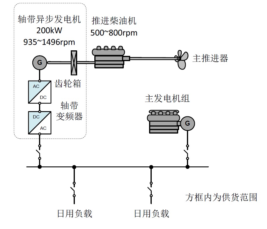 高欄01/02散貨船,采用S-Hybrid混合動力系統(tǒng),額定功率功率為200kW 。軸帶電機經(jīng)齒輪箱與主機自由端連接,在經(jīng)濟航行工況混合動力系統(tǒng)利用主機冗余功率為全船供電,顯著提升主機能效,降低航運成本,對提高航運的經(jīng)濟效益起到良好作用。